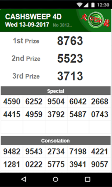 Recent Cash Sweep 4D Winning Numbers. 4D Result or Result 4D for Malaysia 4D Singapore 4D and Cambodia 4D. 0121 0206 2926 3096 3482 5577 7761 7798 7847.